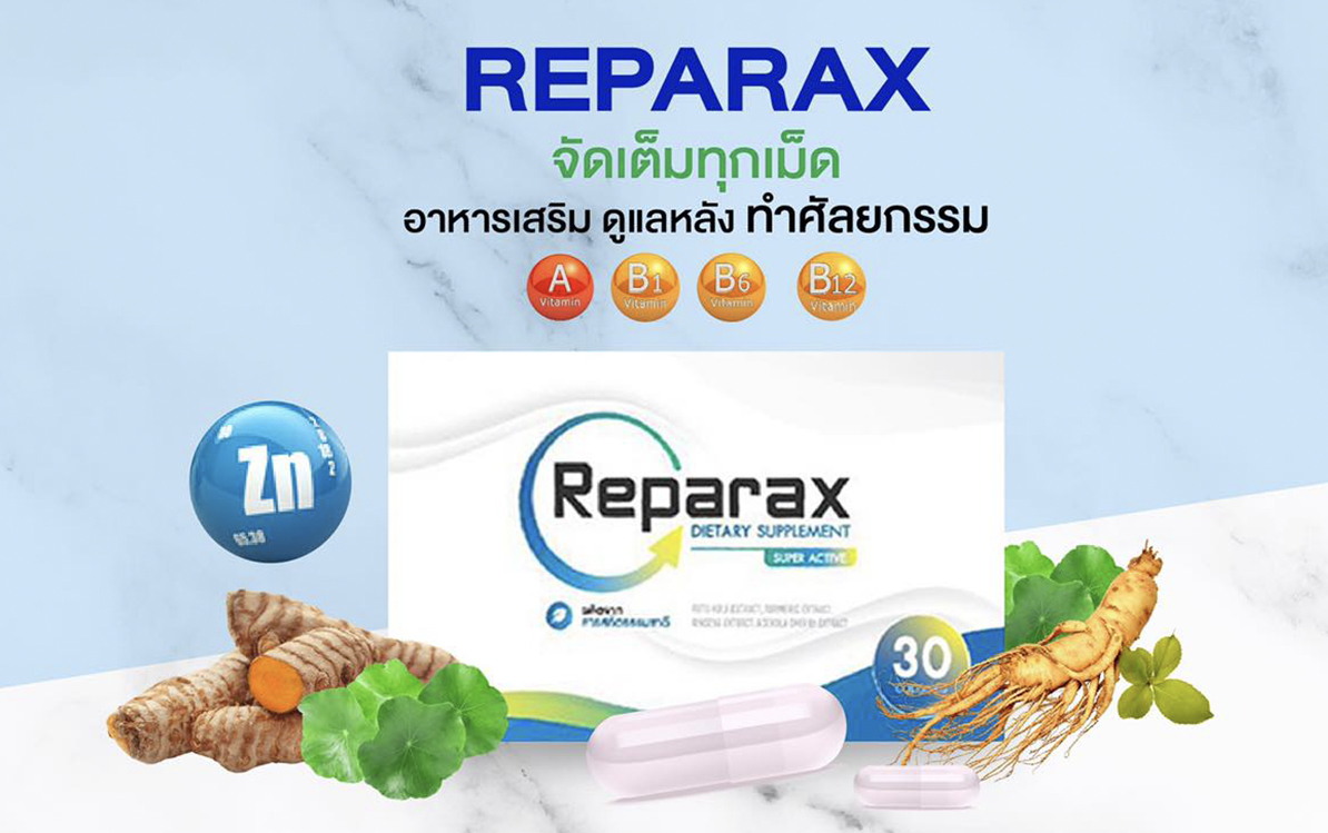 Reparax อาหารเสริมหลังการทำศัลยกรรมหรือหัตถการใดๆที่เกิดมีอาการบวมช้ำ Reparax จะช่วยบรรเทาอาการบวม ช้ำ ช่วยลดอาการอักเสบจากแผล ฟื้นฟูร่างกายและยังช่วยเร่งสมานแผลให้หายไวขึ้นอีกด้วย